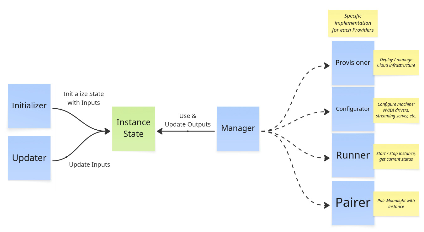 Each Provider implements its own state interface based on a common State implementation. State is by default persisted as a local YAML file under ~/.cloudypad/instance/<name>/state.yml